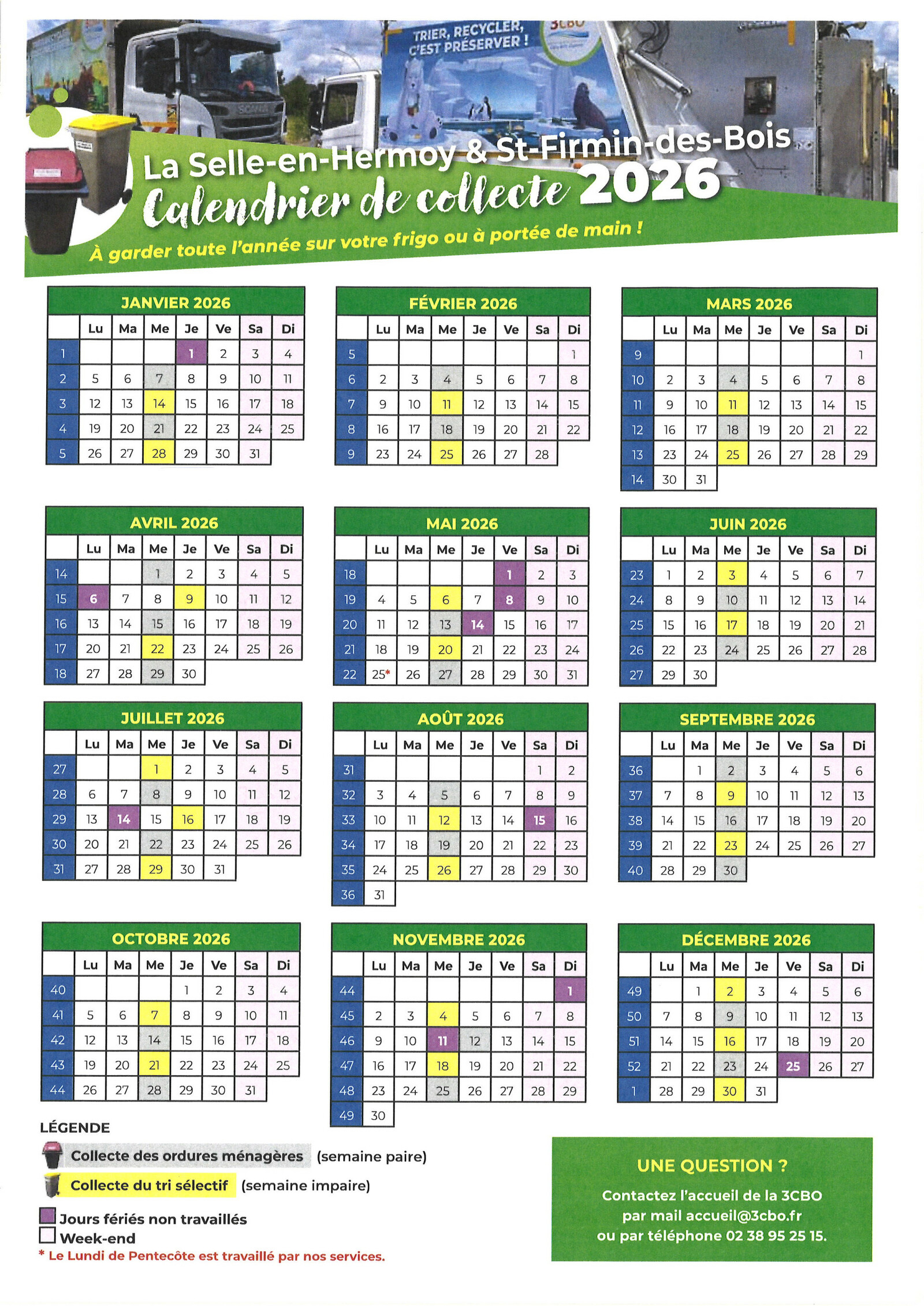 | La collecte des déchets (ordures ménagères) est gérée par la Communauté de Communes. Elle a lieu le mercredi pour notre commune. Merci de sortir votre bac la veille au soir. Toutes les infos sur les collectes Pour les déchets recyclables, des colonnes de tri sélectif sont à votre disposition (à la mare des Tilleuls et rue du Bois de la Chenille, à côté du local technique) Ces dernières sont marquées d’un repère sur le plan. Une carte d’accès est nécessaire pour entrer dans les déchèteries de la 3CBO. Vous trouverez le formulaire de demande et les horaires d’ouverture en cliquant sur CE LIEN A compter du 05 JUIN 2024 collecte du tri sélectif (bac jaune) un mercredi sur deux en alternance avec la collecte des ordures ménagères (voir calendrier des collectes 2024)